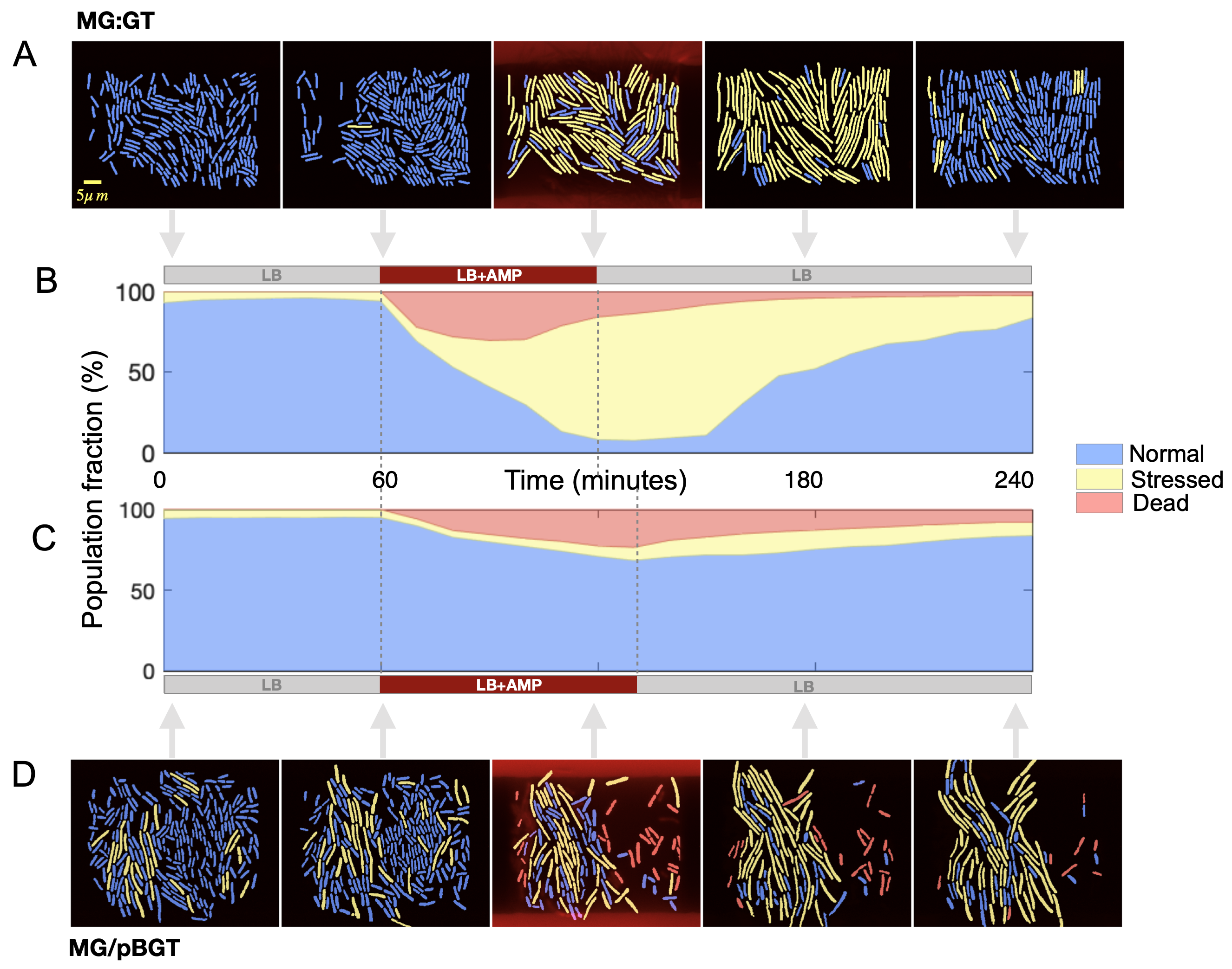 Experimental model: E. coli K12 MG1655 bearing a \(ColE1-like\) (p15a) plasmid, pBGT, encoding for the \(β-lactamase\) resistance gene \(bla_{TEM-1}\) that confers resistance to ampicillin, an \(eGFPmut2\) gene under an arabinose inducible promoter, and the \(araC\) repressor.